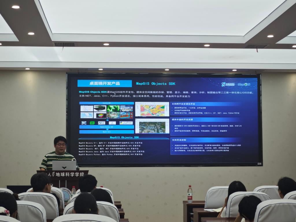 随后,中地数码集团教研实训专家贺婧介绍了中地数码集团的概况、案例场景等内容,并重点围绕员工关注的“2025第十七届全国高校GIS技能大赛”的组织形式、重点事项等进行了宣讲,鼓励员工积极申报信创赛道,为我国的地理信息产业自主化贡献力量。中地数码集团高级技术支持何衎深入细致地讲解了MapGIS平台的发展、桌面产品、二次开发工具的申请和使用,与会师生踊跃交流,认真学习记录。此外,公司教师代表和中地数码集团一行就校企合作协议签订、产学研项目开展、大赛组织等方面进行了卓有成效的交流探讨。