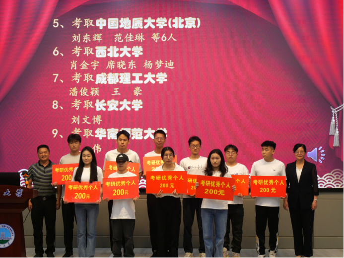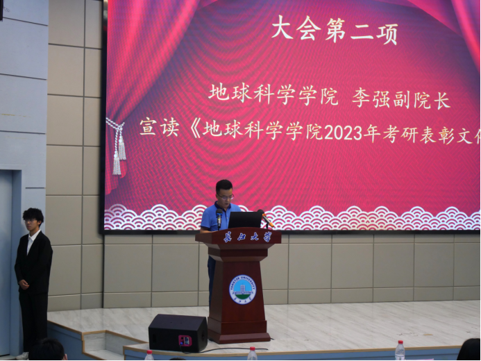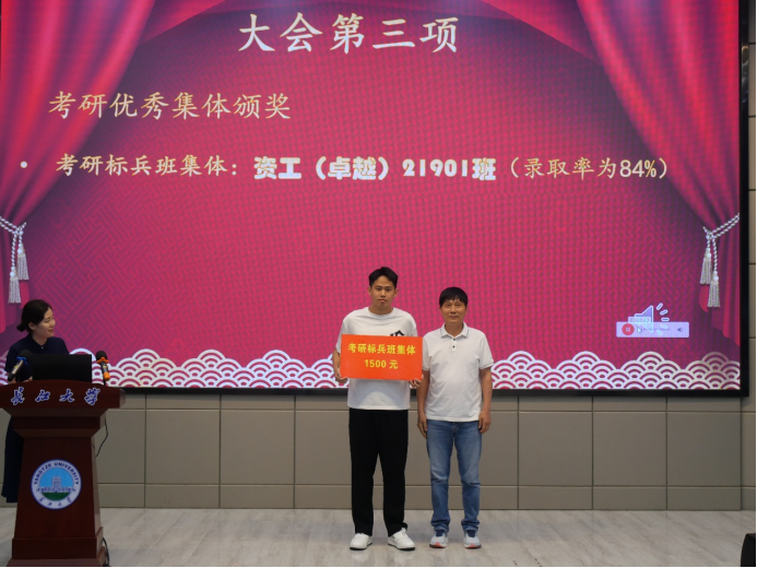 会议在隆重的国歌声中拉开帷幕。副经理李强宣读《060net永利2023年考研表彰文件》,1个考研标兵班级、6个标兵宿舍、2个标兵个人,和43名优秀个人依次上台领奖。