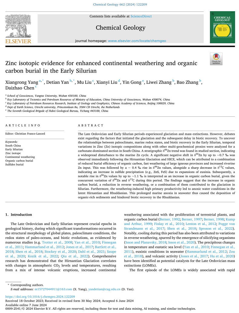 060net永利地质系教师杨向荣在地学TOP期刊《Chemical Geology》上发表题为“Zinc isotopic evidence for enhanced continental weathering and organic carbon burial in the Early Silurian”的研究论文。
