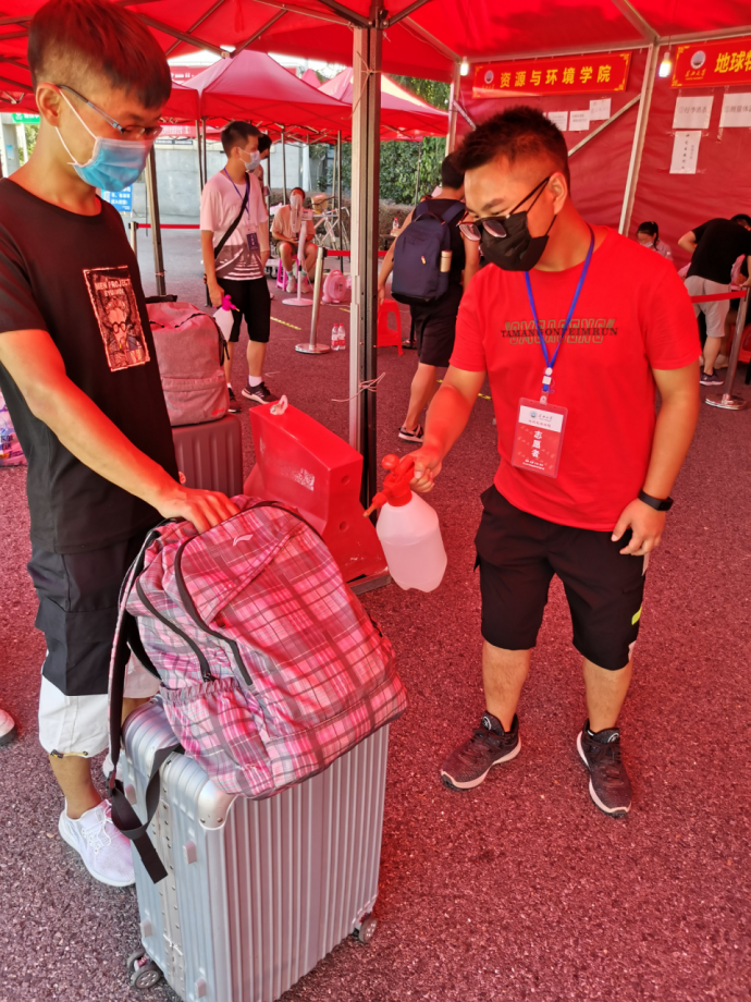 烈日炎炎,犹如同学们对校园的热情不减。到校同学们在校门前往指定地点有序排队,彼此间隔一米,公司辅导员老师和员工志愿者们进行体温测量、行李消毒、信息核实、检验健康码等工作,一切都在有条不紊的进行着。合格的同学在工作人员引导下,按要求走专用通道返回了宿舍。