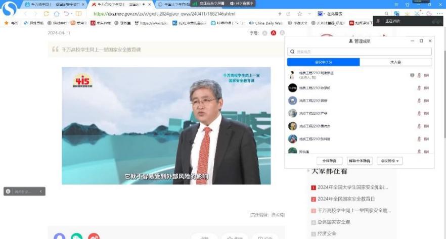 4月14日下午三时,各班通过线下线上相结合的方式,由各班班长带领同学们集中观看了“千万高校员工同上一堂国家安全教育课”主题直播公开课。视频从政治安全、国土安全、军事安全、经济安全、文化安全、社会安全、网络安全等七个方面向同学们普及了国家安全的相关内容,引导大家深刻理解国家安全的重要性,积极践行总体国家安全观。