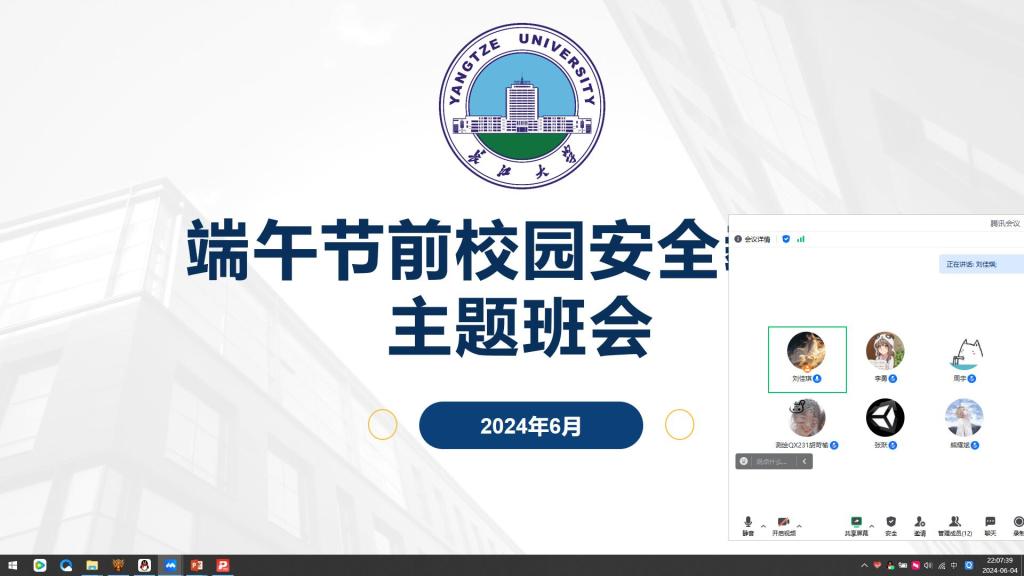 (通讯员 王晗)端午节临近,为增强公司员工假期安全防范意识,提升自护自救能力,确保员工愉快、平安度过节日。公司于6月4日组织全院本研究生召开端午节假期安全教育主题班会,以线上线下相结合的方式,由班主任或班委召开端午节假期安全教育主题班会,全面收集员工离校去向、时间及行程安排。