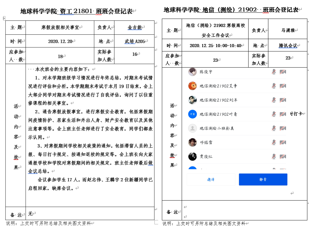 主题班会由各班主任老师组织召开,班主任老师从寒假前、返回途中、寒假中、返校前和违纪处理五个部分向同学们提出了具体的安全及防控要求:所有在校生圣诞节、元旦节不得外出、不得参加校内外聚集性活动;如实填报假期行程,“一人一档”制定台账;同学们离校后必须直接回家,校家两地一线,不得中途改变行程;未经批准,一律不得私自返校、提前返校;如违反公司疫情防控要求将受到纪律处分。部分班级还开展的了期末复习动员会及考试诚信教育。