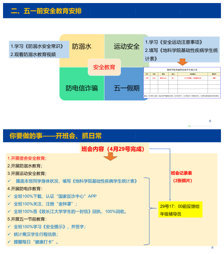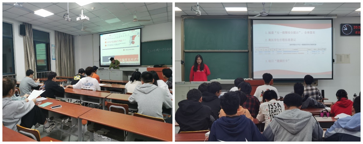 根据会议要求安排,公司所有班级已于4月26日—29日召开五一假期安全教育主题班会,全院员工100%下载实名注册“国家反诈中心”APP、100%关注实名注册“金钟罩”公众号、100%签署防诈“致永利官网员工的一封信”回执、100%报备假期离汉行程、100%签署五一假期安全告知书。