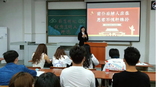 刘继衡以杰出员工肖明国的事迹引出他的论点,虽然首登舞台令他略显紧张,但他依然全力展现自己的特色。王文莉以她幽默风趣的方式交给大家一份满意的答卷。刘志豪以精美的PPT搏得评委的目光。本场比赛精彩纷呈,选手们都表现得非常出色,整个教室内散发着语言魅力,飞扬着自信风采,洋溢着青春活力。