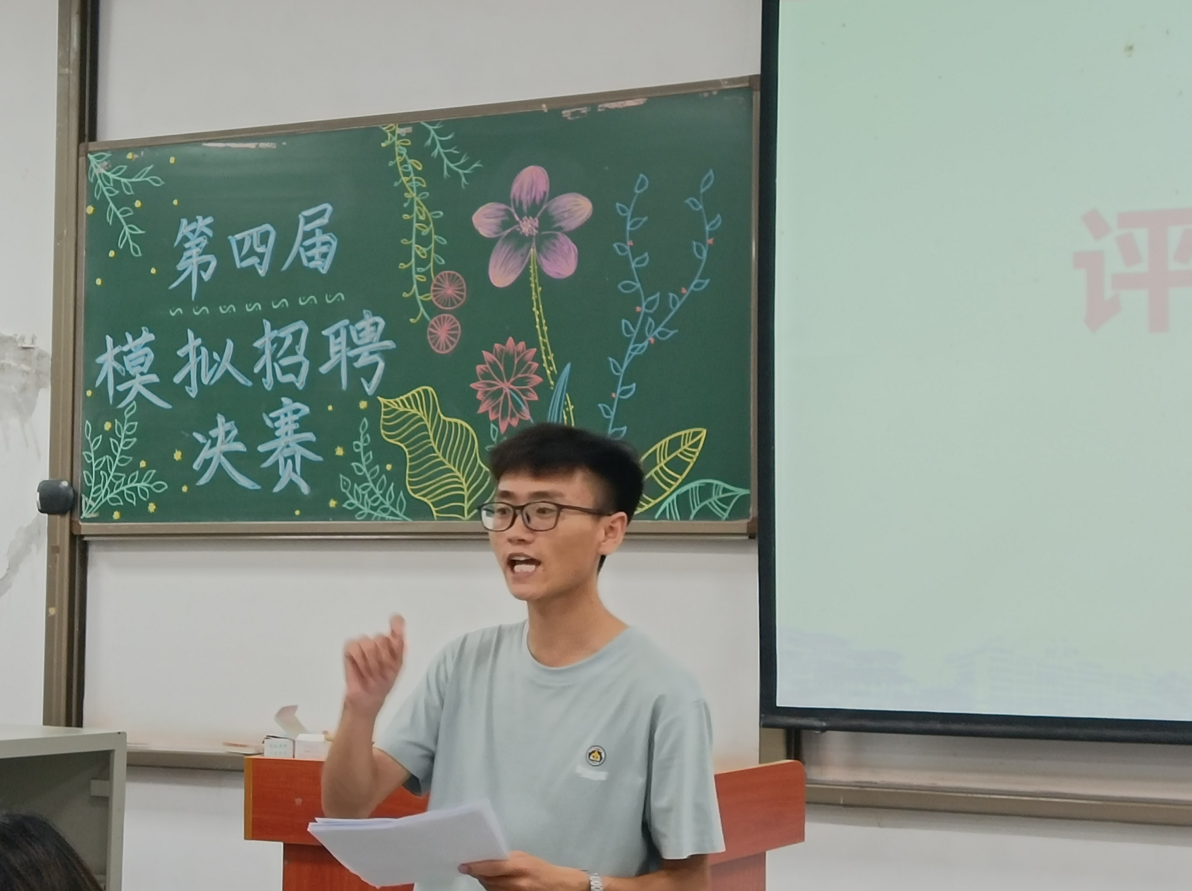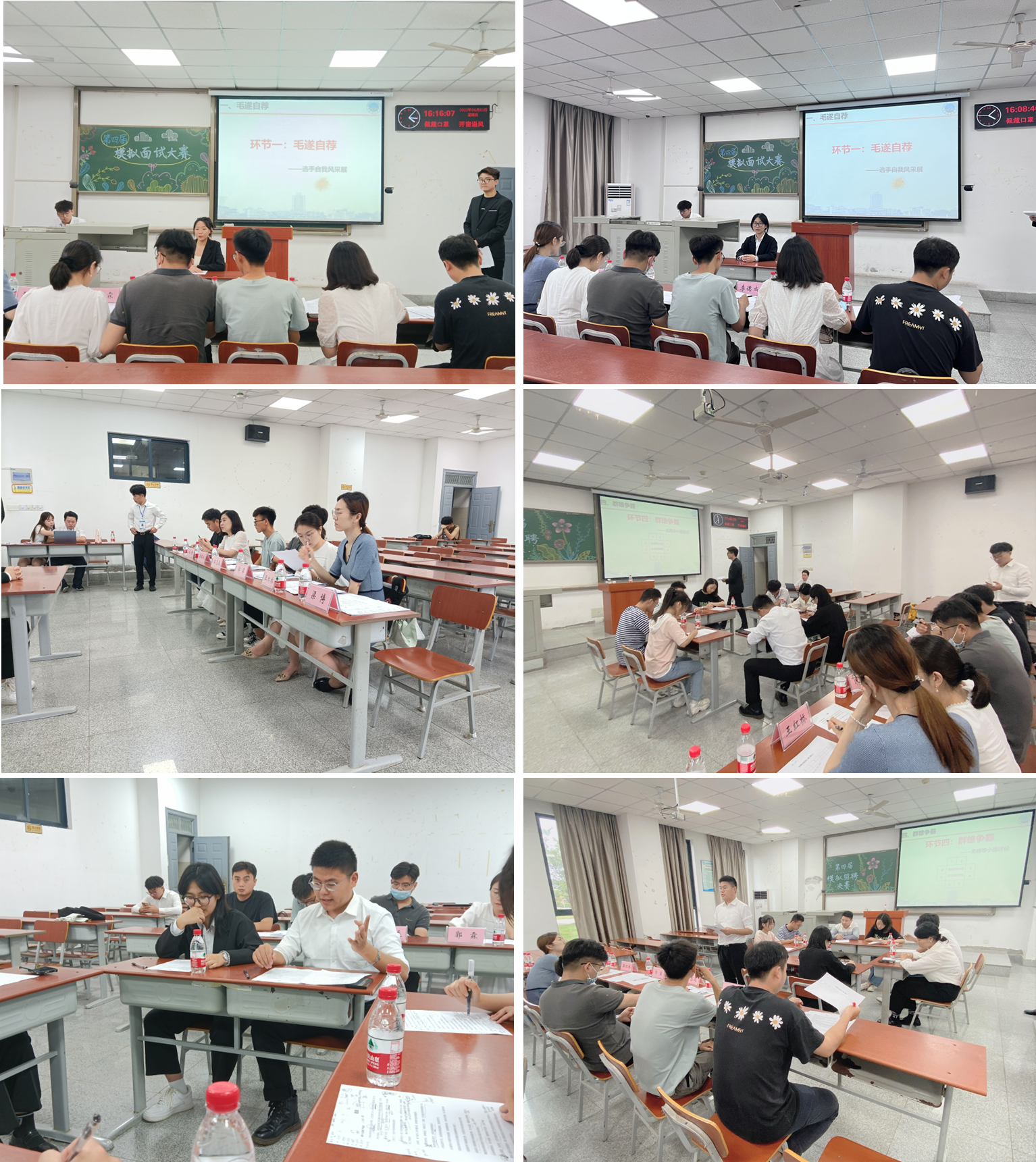 晋级本次大赛的16位优秀选手依次进行情景面试,选手根据自身优势开展自我介绍,需要在有限的时间内将自己的优势和特长展示出来;在应对评委的提问环节,选手们逻辑清晰、目标明确、一一作答。随后,第一轮得分位于前八名的同学进入无领导小组讨论环节。最终,经过精彩角逐,选手徐露元凭借其优异的表现取得第一名,李天文,郭浩宇荣获二等奖,何一鸣、杨孟瑶、杨肖利、王文静、刘福贵荣获三等奖。