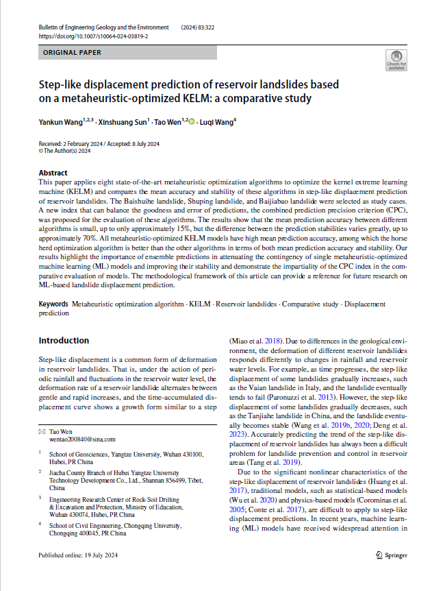 060net永利教师王艳昆副教授以第一作者身份在2区SCI期刊《Bulletin of Engineering Geology and the Environment》发表题为《Step-like displacement prediction of reservoir landslides based on a metaheuristic-optimized KELM: a comparative study》的研究论文。060net永利为论文的第一署名单位,地质(工程)22001班本科生孙新爽为该文第二作者,温韬副教授为该文通讯作者,本项研究得到国家自然科学基金项目、湖北省自然科学基金项目、西藏自治区科技计划项目、青海省科技计划项目和老员工创新创业训练计划项目共同资助。