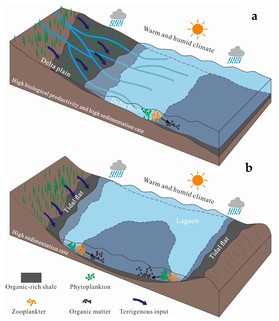 综合研究发现,黔北海陆过渡相页岩的富集受古气候、水体氧化还原性质、古生产力、沉积速率控制,其中古生产力和水体氧化还原性质对TOC的控制作用相对更强。在以上研究的基础上,本研究还建立了黔北龙潭组富有机制页岩沉积模式。这项研究对于中国南方海陆过渡相页岩气的新领域勘探提供了科学依据。