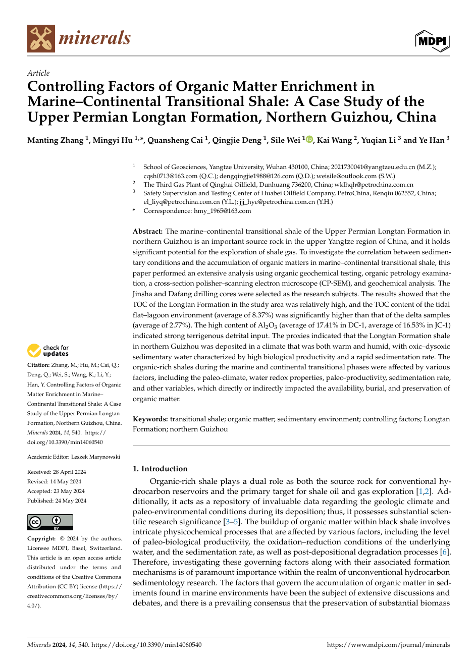 060net永利地质系胡明毅教授团队长期从事储层沉积学及页岩气资源评价等方向的研究。团队成员张曼婷博士在期刊《Minerals》上发表题为《Controlling Factors of Organic Matter Enrichment in Marine–Continental Transitional Shale: A Case Study of the Upper Permian Longtan Formation, Northern Guizhou, China》的研究论文,060net永利为论文第一署名单位,博士生张曼婷为论文第一作者,其导师胡明毅教授为该文通讯作者。