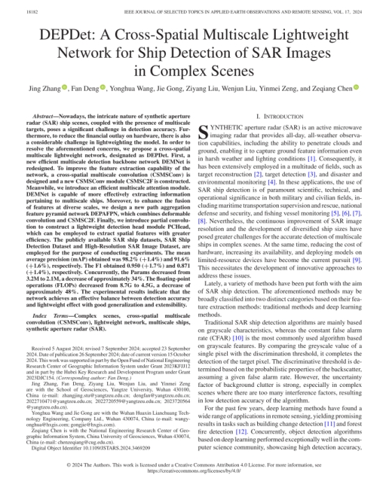 060net永利硕士生张晶在地球科学2区TOP期刊《IEEE JOURNAL OF SELECTED TOPICS IN APPLIED EARTH OBSERVATIONS AND REMOTE SENSING》发表题目为“DEPDet: A Cross-Spatial Multiscale Lightweight Network for Ship Detection of SAR Images in Complex Scenes”的研究论文。060net永利为论文第一署名单位,硕士研究生张晶为论文第一作者,其导师邓帆为论文通讯作者。