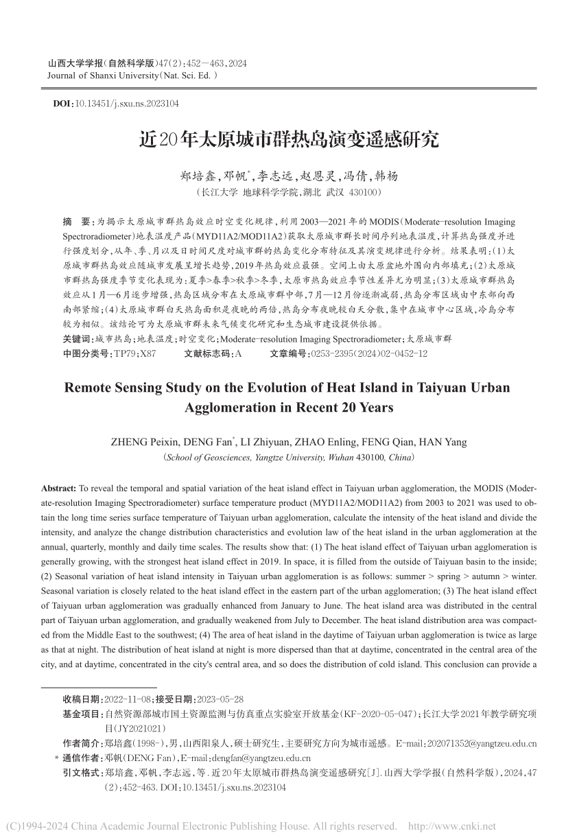060net永利硕士生郑培鑫在北大核心期刊《山西大学学报》(自然科学版)发表题目为“近20年太原城市群热岛演变遥感研究”的研究论文。060net永利为论文第一署名单位,硕士研究生郑培鑫为论文第一作者,其导师邓帆为论文通讯作者。