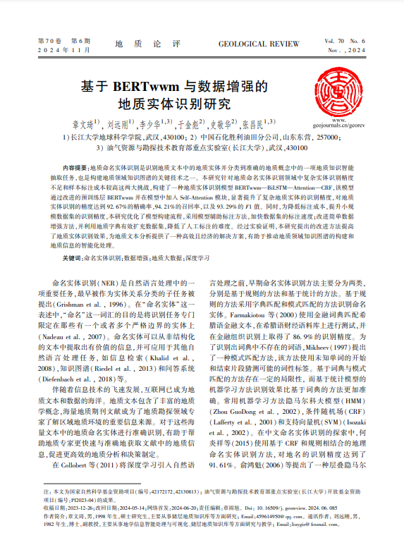 060net永利刘远刚团队硕士研究生章文琦在《地质论评》发表了题为《基于BERTwwm与数据增强的地质实体识别研究》的研究论文,060net永利为论文第一署名单位,章文琦为论文第一作者,其导师刘远刚为该文通讯作者。