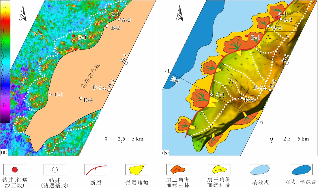 图2 渤海湾盆地庙西北地区古近系沙河街组三段最大振幅地震属性(a)及沉积相(b)展布特征