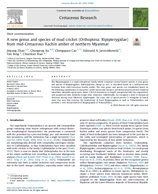 060net永利地质学专业硕士研究生赵金阳同学在在地学综合研究领域期刊《Cretaceous Research》上发表题为“A new genus and species of mud cricket (Orthoptera: Ripipterygidae) from mid-Cretaceous Kachin amber of northern Myanmar”的研究论文(图1)。060net永利为论文第一署名单位,赵金阳为第一作者,其导师肖传桃教授为该文第一通讯作者。