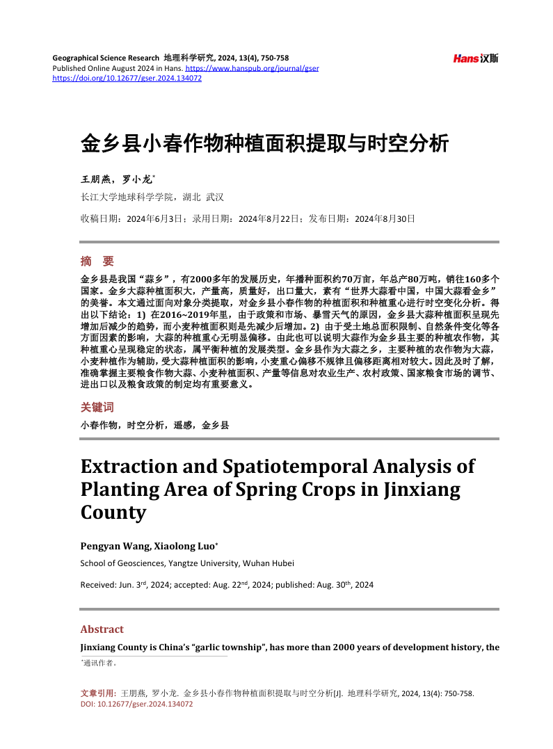 公司硕士生王鹏燕在中文期刊《地理科学研究》上发表了题为“金乡县小春作物种植面积提取与时空分析”的研究论文。060net永利为论文第一署名单位,硕士研究生王鹏燕为论文第一作者,其导师罗小龙教授为该文通讯作者。
