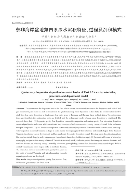 060net永利硕士生于星在《断块油气田》发表题为“东非海岸盆地第四系深水沉积特征、过程及沉积模式”的研究论文。060net永利为论文第一署名单位,硕士生于星为论文第一作者,教师李华为通讯作者。