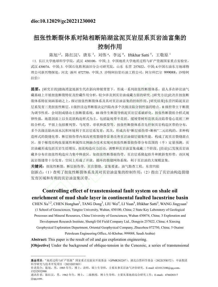 060net永利陈旭副教授以第一作者身份在《中国地质》权威期刊上发表题为“扭张性断裂体系对陆相断陷湖盆泥页岩层系页岩油富集的控制作用”的研究论文,该项研究得到了湖北省自然科学基金的资助。