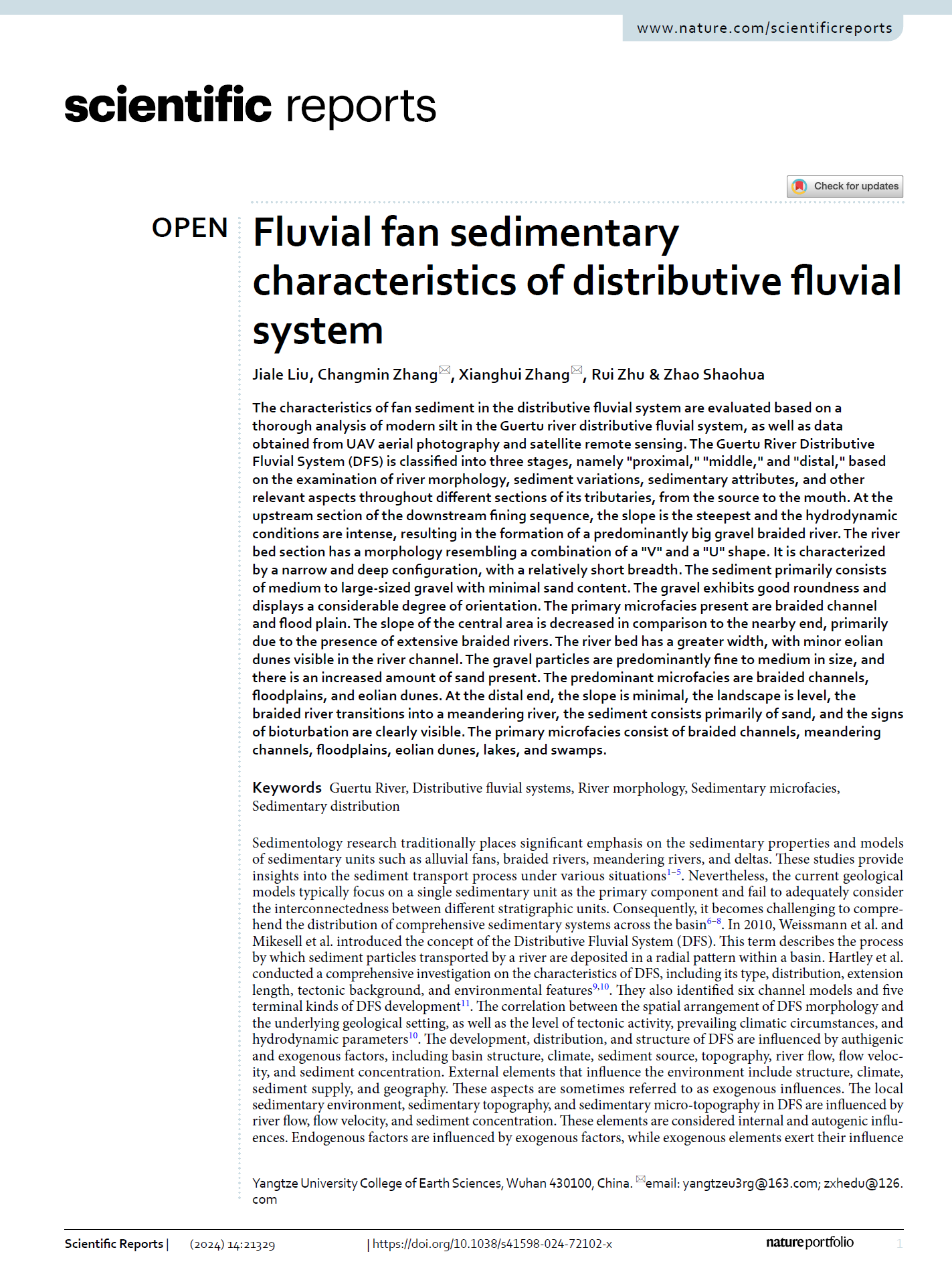 060net永利博士生刘家乐在期刊《scientific reports》上发表题为“Fluvial fan sedimentary characteristics of distributive fluvial system”的研究论文。060net永利为论文第一署名单位,张昌民教授、张祥辉博士为共同通讯作者,本项研究得到国家自然科学基金重点项目、湖北省自然科学基金项目共同资助。