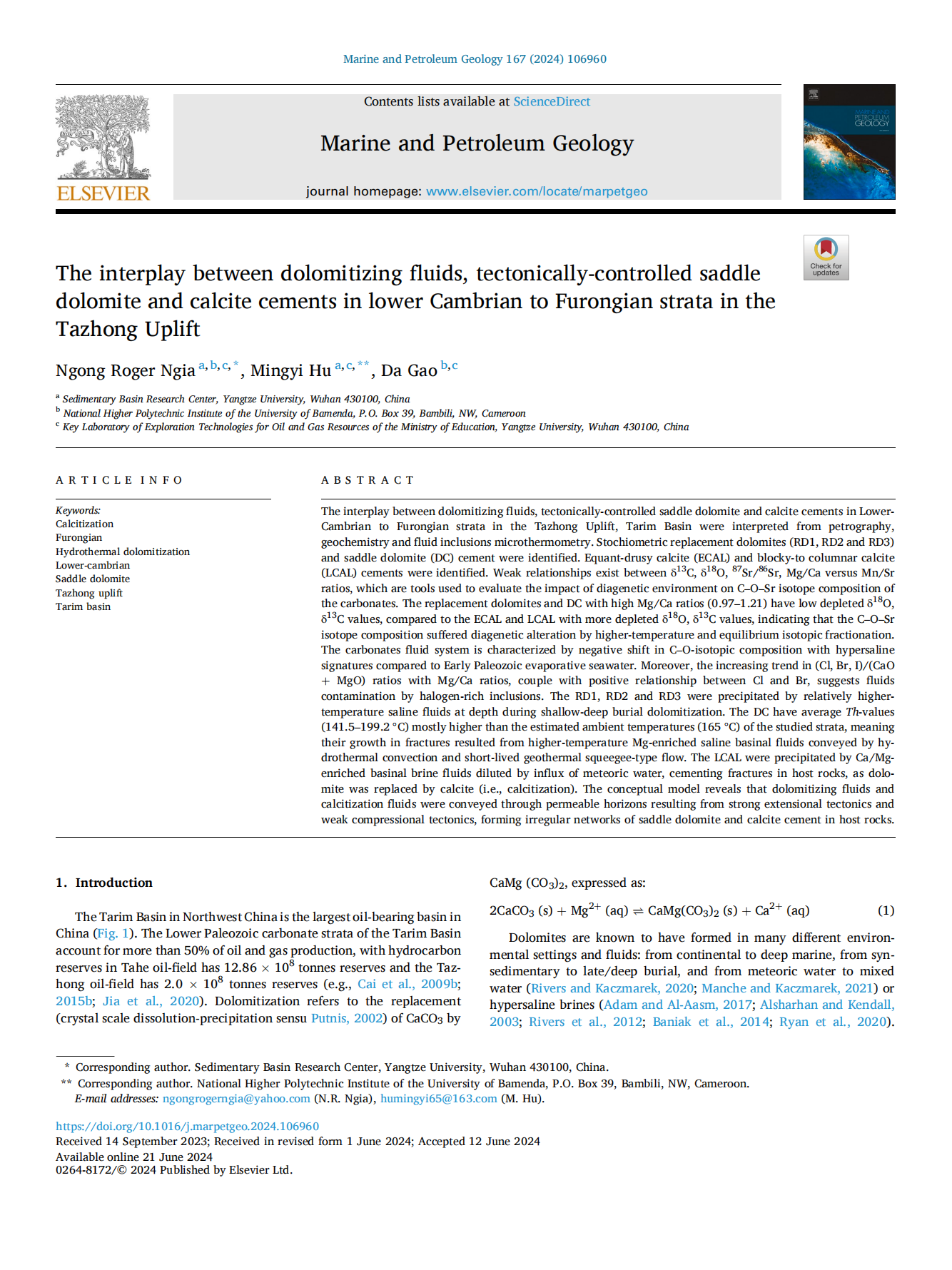 060net永利胡明毅教授团队在石油地质领域主流期刊《Marine and Petroleum Geology》发表了题为“The interplay between dolomitizing fluids, tectonically-controlled saddle dolomite and calcite cements in lower Cambrian to Furongian strata in the Tazhong Uplift”的研究论文。