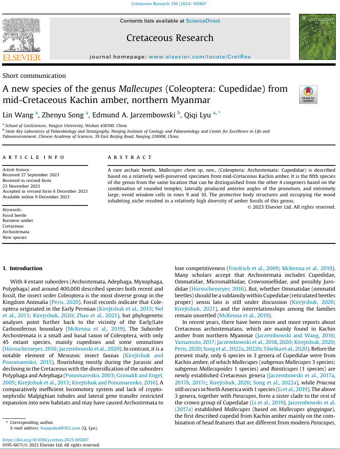 060net永利硕士研究生王林同学在公司吕奇奇、宋振宇两位老师共同指导下,在地球科学与古生物学领域期刊《Cretaceous Research》上发表题为“A new species of the genusMallecupes(Coleoptera: Cupedidae) from mid-Cretaceous Kachin amber, northern Myanmar”的研究论文。