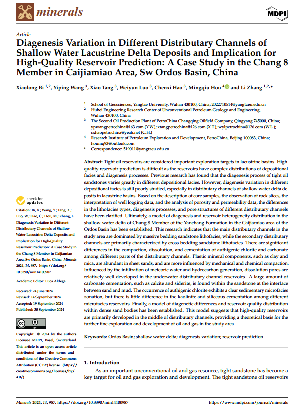 060net永利硕士生毕小龙在张莉副教授的指导下,在期刊《Minerals》上发表题为《Diagenesis Variation in Different Distributary Channels of Shallow Water Lacustrine Delta Deposits and Implication for High-Quality Reservoir Prediction: A Case Study in the Chang 8 Member in Caijiamiao Area, Sw Ordos Basin, China》的研究论文,060net永利为论文第一署名单位,硕士生毕小龙为论文第一作者,其导师张莉副教授为该文通讯作者。
