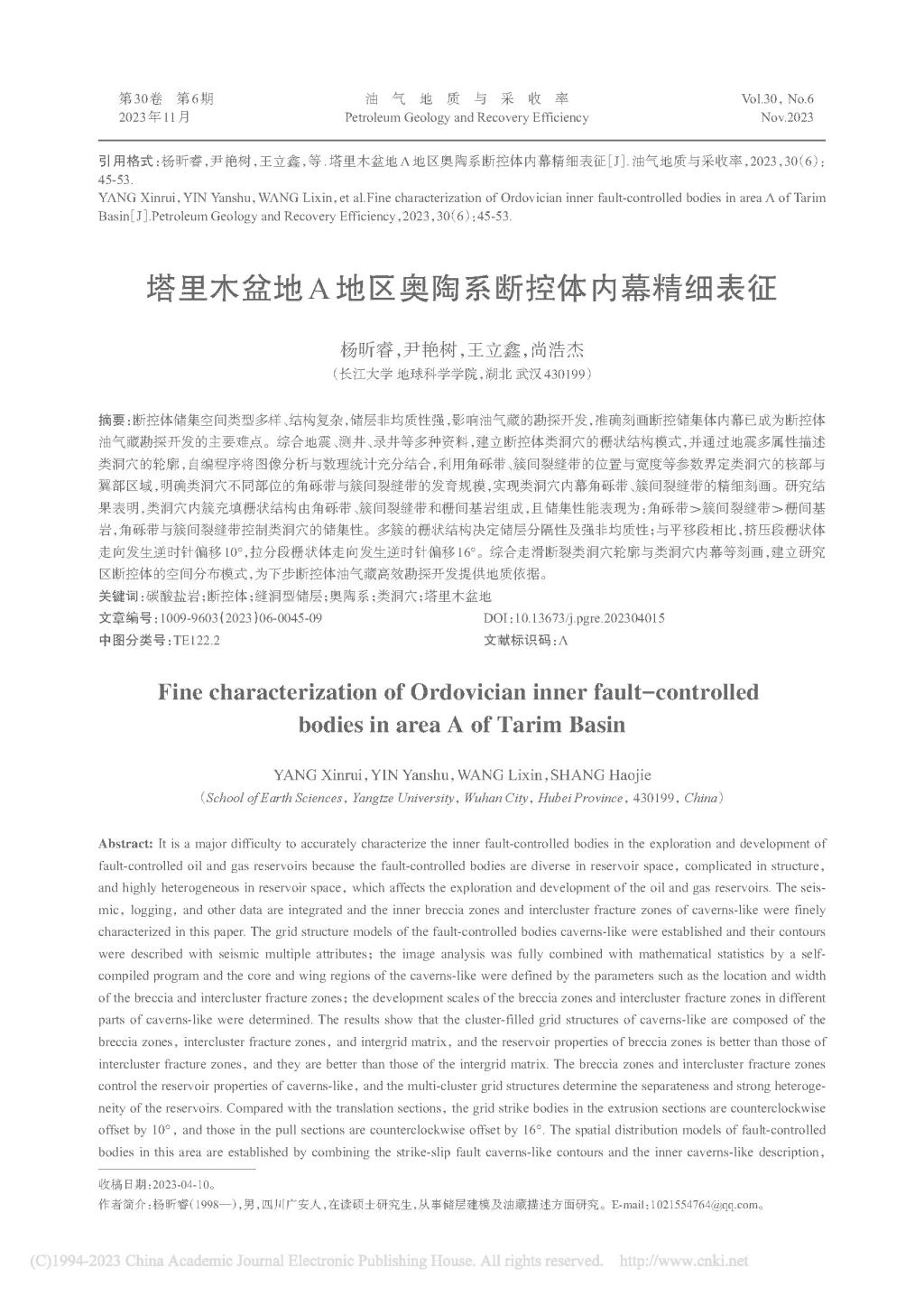 060net永利地质学研究生杨昕睿在《油气地质与采收》上发表了题为“塔里木盆地A地区奥陶系断控体内幕精细表征”的研究论文。