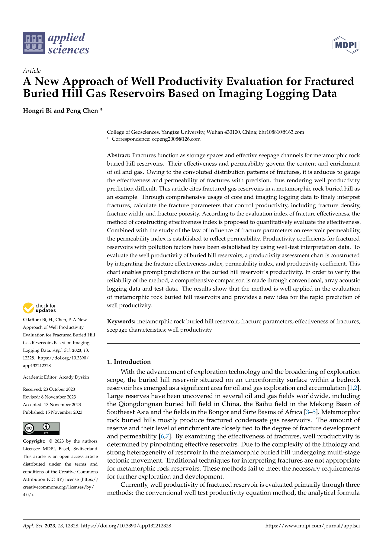 060net永利硕士生毕宏日在《Applied Sciences》发表题为“A New Approach of Well Productivty Evaluation for Fractured Buried Hill Gas Reservoirs Based on lmaging Logging Data”的研究论文。060net永利为论文第一署名单位,硕士生毕宏日为论文第一作者,教师陈鹏为通讯作者。