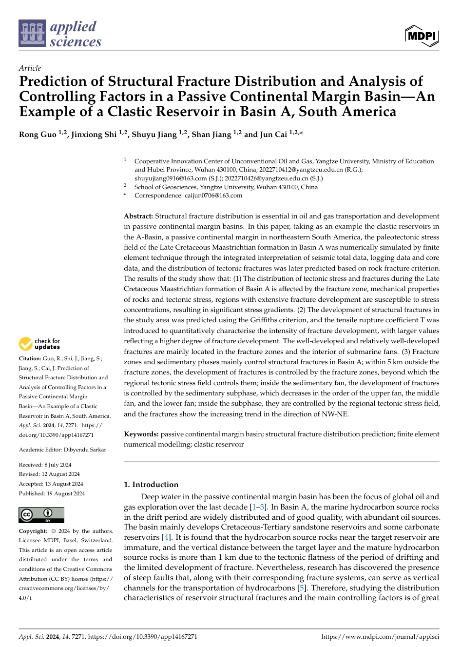 060net永利硕士研究生郭蓉在《applied sciences》上发表题目为“Prediction of Structural Fracture Distribution and Analysis of Controlling Factors in a Passive Continental Margin Basin—An Example of a Clastic Reservoir in Basin A, South America”的研究论文。该研究通过采用有限元构造数值模拟技术,探讨了被动陆缘盆地的古构造应力场及其裂缝分布特征。研究结果表明被动陆缘盆地先存断裂区域容易出现应力集中,有利于裂缝发育,有效控制距离可达5公里;较大的伸展破裂系数表明被动陆缘海底扇内部也是裂缝发育的优势指向区,发育强度的差异受控于岩石力学参数的变化。