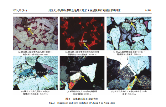 鄂尔多斯地区长8储层为低孔超低渗储层也是为致密油聚集非常好的储层,受不同的物源岩石类型有所差异,长石砂岩含量发育,长石岩屑砂岩含量较低。安塞地区主要发育原生粒间孔隙与残余粒间孔安塞地区平均孔隙半径在30 μm左右,说明该地区储层性质稳定。压汞分析表明储层喉道以细喉为主,孔隙半径较小。喉道是影响储层渗透率的重要决定因素,其影响安塞地区长8储层储集油气空间大小, 渗透率较低属于低孔-超低渗,安塞地区喉道体积占有效储集空间比较大、喉道半径也大,表明安塞地区渗透率最高,储集性能最好,该地区为致密油储层。该地区为低孔-超低渗储层来讲,控制因素有成岩作用,黏土矿 物胶结物与浊沸石胶结物作用作为标志产物,浊沸石胶结作用在安塞地区长8储层中是十分重要的成岩作用,而安塞地区发育浊沸石胶结物,这对安塞地区长8储层致密油储集判别十分重要长8段成储主要受黏土矿物胶结物的影响,使储层孔深降低,导致安塞地区低孔超低渗。