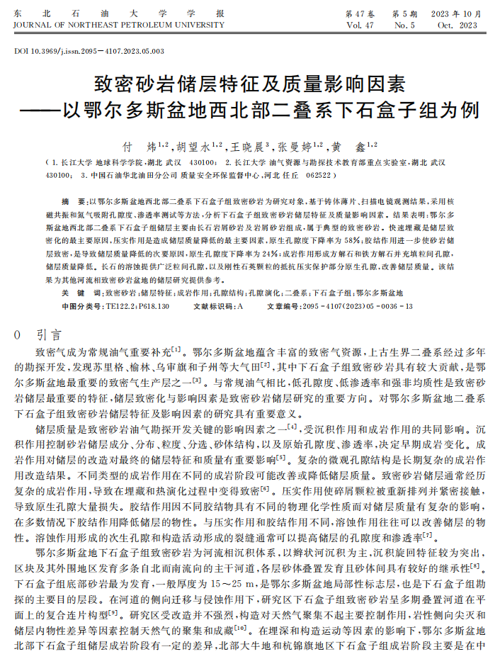 060net永利博士生付炜在期刊《东北石油大学学报》上发表题为“致密砂岩储层特征及质量影响因素———以鄂尔多斯盆地西北部二叠系下石盒子组为例”的研究论文。060net永利为论文第一署名单位,胡望水教授为通讯作者,本项研究得到国家自然科学基金重点项目项目资助。