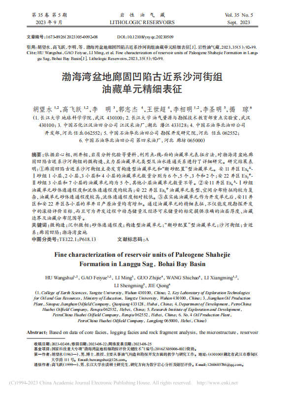 060net永利胡望水教授以第一作者身份在《岩性油气藏》权威期刊上发表题为“渤海湾盆地廊固凹陷古近系沙河街组油藏单元精细表征”的研究论文,高飞跃硕士为通讯作者。该项研究得到了国家科技重大专项“渤海湾盆地精细勘探评价关键技术的资助。