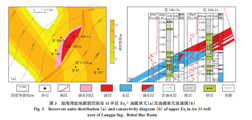 渤海湾盆地廊固凹陷古近系沙河街组的微构造、主力层油藏单元类型及油水连通关系进行了详细研究。研究结果表明:①廊固凹陷古近系沙河街组主要发育构造型油藏单元和“断砂配置”型油藏单元。安11井区Es4 上-Ⅰ砂组1小层、2小层、3小层和4小层的油藏单元数量分别为 6个、5个,3个和2个;安 22 井区 Es3 中-Ⅱ砂组 3 小层和7小层的油藏单元均为5个,其他小层油藏单元数量不等。②安11井区 Es4 上-Ⅰ砂组油藏单元砂体连通程度和流体连通程度均较高;安22 井区 Es3 中油藏单元类型、空间分布特征均较为复杂,油藏单元砂体连通程度较高、流体连通程度相对较低。