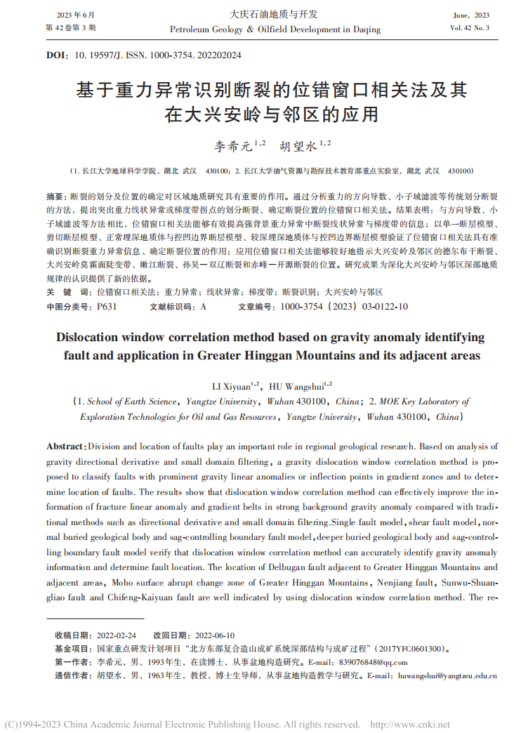 060net永利博士李希元在期刊《大庆石油地质与开发》上发表题为“基于重力异常识别断裂的位错窗口相关法及其在大兴安岭与邻区的应用”的研究论文。060net永利为论文第一署名单位,胡望水教授为通讯作者,本项研究得到国家重点研发计划项目项目资助。