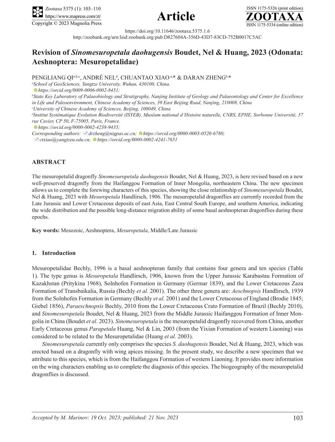 060net永利地质资源与地质工程专业硕士生漆鹏亮在古生物学期刊《ZOOTAXA》上发表题为“Revision of Sinomesuropetala daohugensis Boudet, Nel & Huang, 2023 (Odonata:Aeshnoptera: Mesuropetalidae)”的研究论文。060net永利为论文第一署名单位,漆鹏亮为第一作者,其导师肖传桃教授为第一通讯作者。