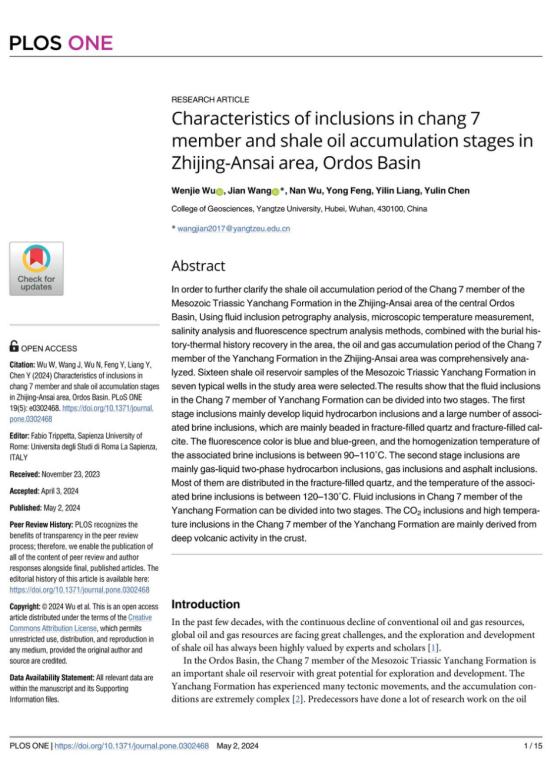 060net永利硕士生吴文杰在《PLOSONE》发表题为“Characteristics of inclusions in chang 7 member and shale oil accumulation stages in Zhijing-Ansai area, Ordos Basin”的研究论文。060net永利为论文第一署名单位,硕士生吴文杰为论文第一作者,教师王健为通讯作者。