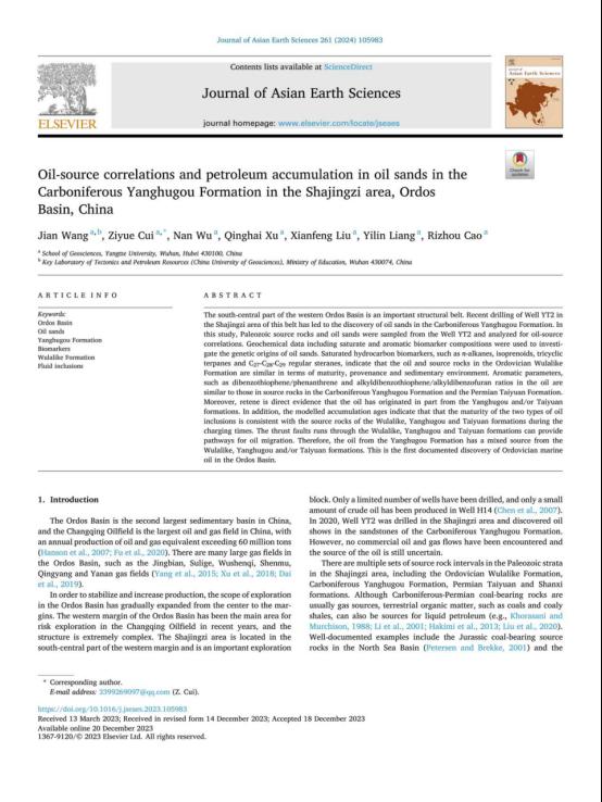 060net永利王健在《Journal of Asian Earth Sciences》发表题为“Oil-source correlations and petroleum accumulation in oil sands in the Carboniferous Yanghugou Formation in the Shajingzi area, Ordos Basin, China”的研究论文。060net永利为论文第一署名单位,教师王健为论文第一作者。