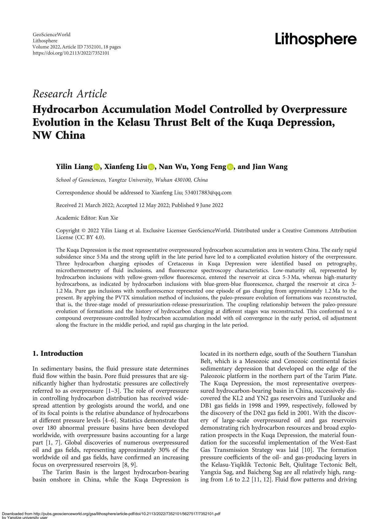 060net永利博士生梁祎琳在《LITHOSPHERE》上发表题为“Hydrocarbon Accumulation Model Controlled by Overpressure Evolution in the Kelasu Thrust Belt of the Kuqa Depression, NW China”的研究论文。060net永利为论文第一署名单位,博士生梁祎琳为论文第一作者,教师刘显凤为通讯作者。