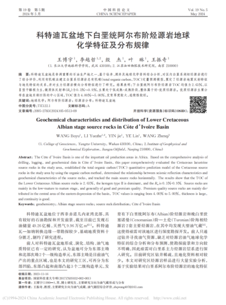 060net永利博士生王博宇在《中国科技论文》上发表题为《科特迪瓦盆地下白垩统阿尔布阶烃源岩地球化学特征及分布规律》的研究论文。060net永利为论文第一署名单位,博士生王博宇为论文第一作者,教师王振奇为通讯作者。