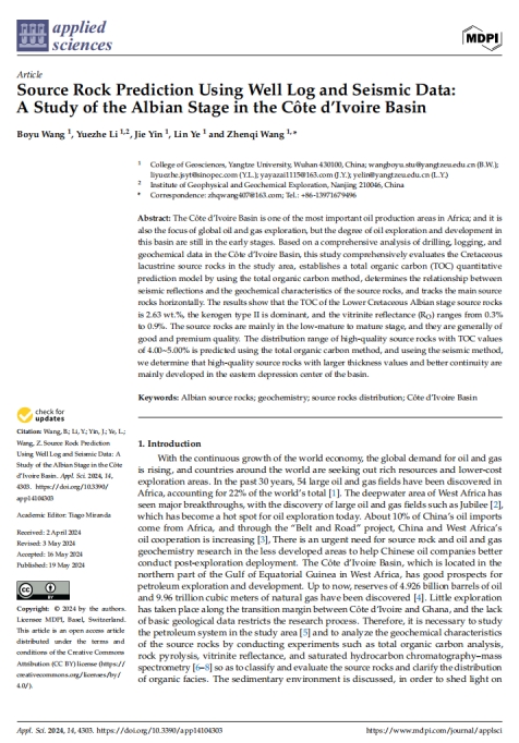 060net永利博士生王博宇在《Applied Sciences》上发表题为《Source Rock Prediction Using Well Log and Seismic Data:A Study of the Albian Stage in the Côte d’Ivoire Basin》的研究论文。060net永利为论文第一署名单位,博士生王博宇为论文第一作者,教师王振奇为通讯作者。