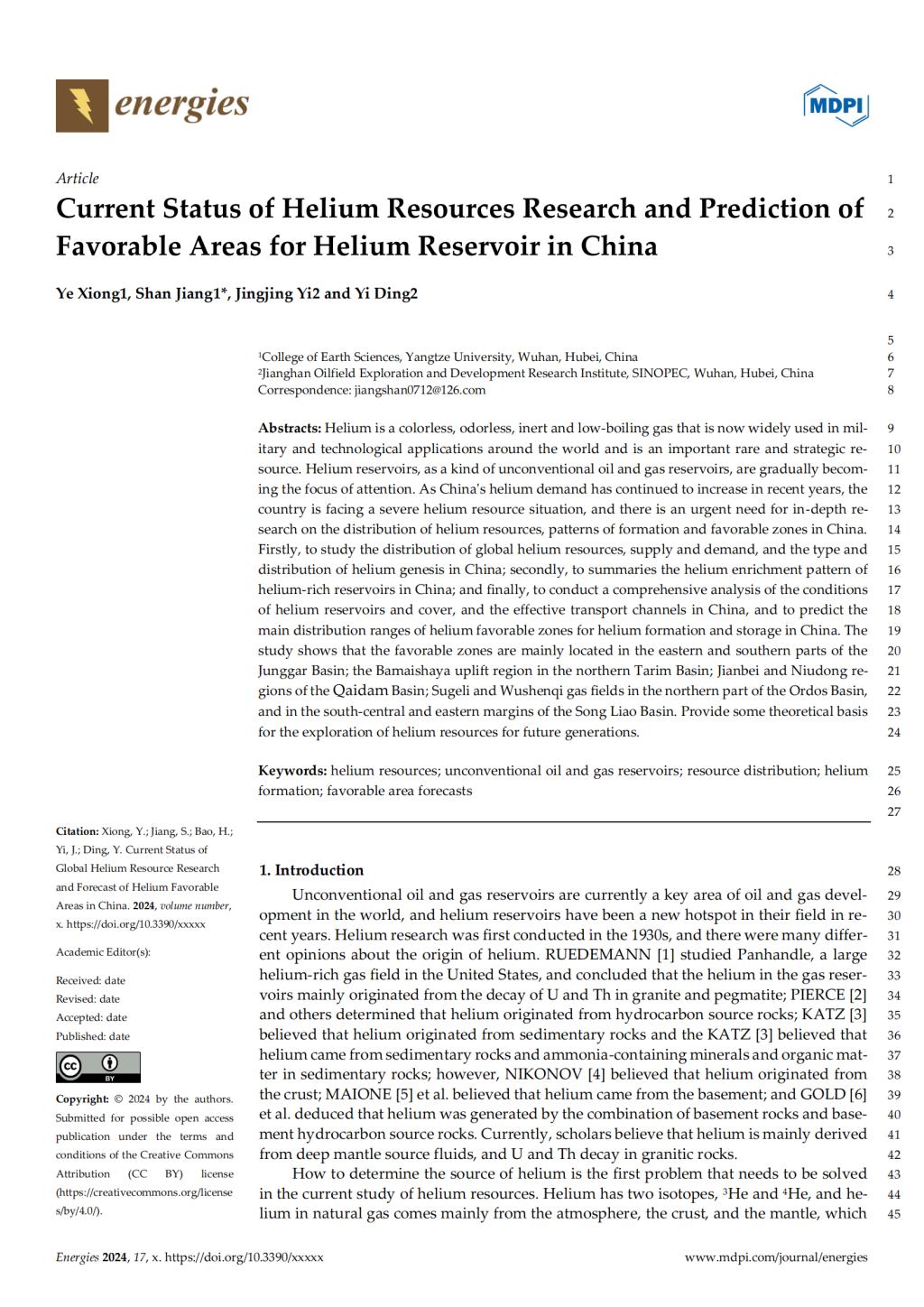 060net永利硕士生熊烨在《Energies》发表题为“Current Status of Helium Resources Research and Prediction ofFavorable Areas for Helium Reservoir in China”的研究论文。060net永利为论文第一署名单位,硕士生熊烨为论文第一作者,教师江山为通讯作者。