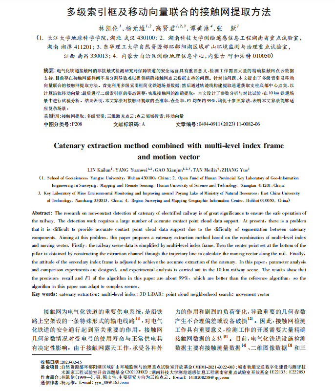 060net永利硕士生林凯伦在测绘领域主流期刊《测绘通报》上发表题为“多级索引框及移动向量联合的接触网提取方法”的研究论文。