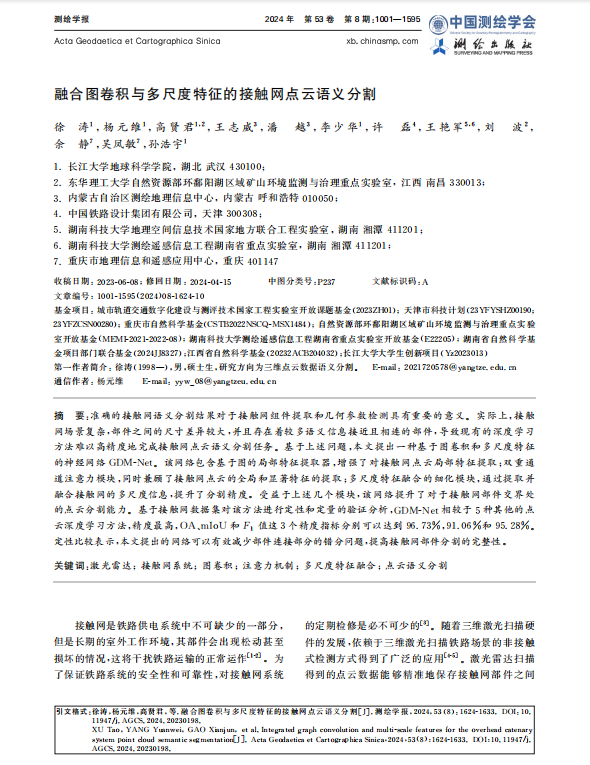 060net永利硕士生徐涛在测绘领域主流期刊《测绘学报》上发表题为“融合图卷积与多尺度特征的接触网点云语义分割”的研究论文。