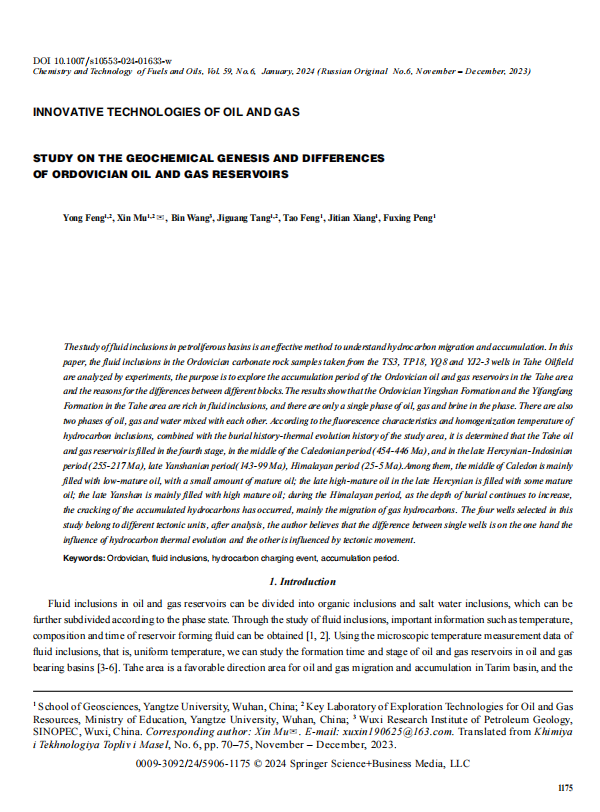 060net永利研究生母鑫以通讯作者身份在《CHEMISTRY AND TECHNOLOGY OF FUELS AND OILS》上发表题为“Study on the Geochemical Genesis and Differences of Ordovician Oil and Gas Reservoirs”的研究论文。对含油气盆地流体包裹体的研究,是认识油气运移和成藏的有效方法。文章通过实验对塔河油田TS3井、TP18井、YQ8井和YJ2-3井随钻取出的奥陶系碳酸盐岩地层样品中的流体包裹体进行分析,旨在探究塔河地区奥陶系油气藏的成藏期次及不同区块之间存在差异的原因。结果表明:塔河地区奥陶系鹰山组和一间房组地层流体包裹体种类丰富,相态上既有油、气、盐水单一相,同样存在油、气、水的两相或多相。根据烃类包裹体的荧光特性和均一温度,结合研究区的埋藏史-热演化史分析确定出塔河油田油气藏为4期充注,分别是加里东中期(454-446Ma)、海西晚期-印支期(255-217Ma)、燕山晚期(143-99Ma)、喜马拉雅期(25-5Ma)。其中加里东中期主要为低熟油充注,夹少量成熟油;海西晚期主要高熟油,夹部分成熟油的充注;燕山晚期主要是高熟油的充注;喜马拉雅期随着埋深的不断增加,发生油气藏的裂解,主要是气烃的活动。本次研究所选的4口井属于不同的构造单元,经过分析笔者认为单井之间的差异一方面是烃类热演化程度的影响,另一方面是受构造运动的影响。