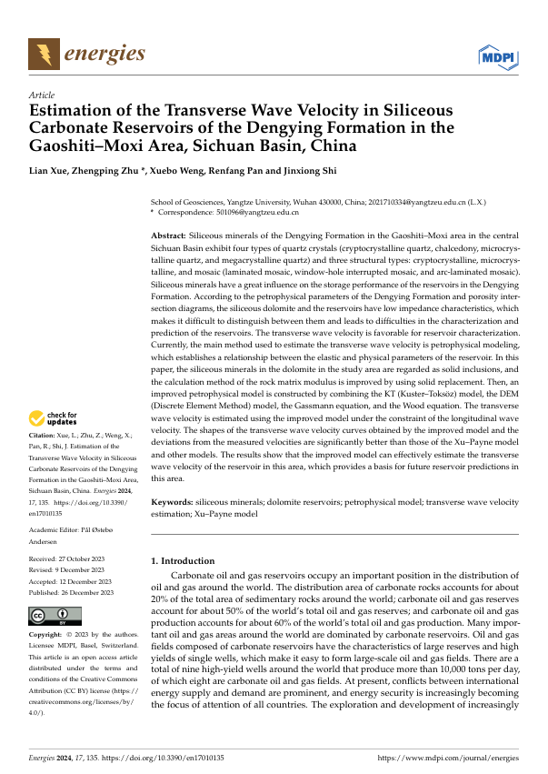 060net永利地科系朱正平博士在地质能源领域主流期刊《Energies》上发表题为“Estimation of the Transverse Wave Velocity in Siliceous Carbonate Reservoirs of the Dengying Formation in the Gaoshiti–Moxi Area, Sichuan Basin, China”的研究论文。