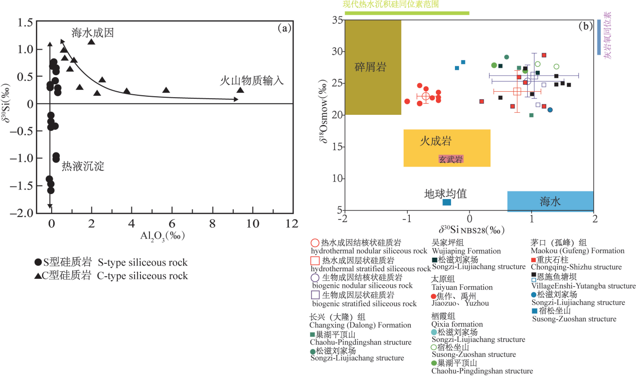 Si同位素可以作为判识硅质岩成因的重要依据。不同成因的硅质岩具有不同的Si同位素特征,通过分析可以推断其形成过程和地质背景(图4)。