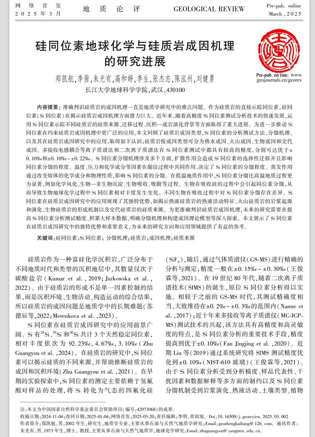 近日,060net永利地质学专业2024级硕士生郑凯航在中文核心期刊《地质论评》发表题为“硅同位素地球化学与硅质岩成因机理的研究进展”的研究论文。060net永利为论文第一署名单位,硕士生郑凯航为论文第一作者,其导师朱光有教授为通讯作者。