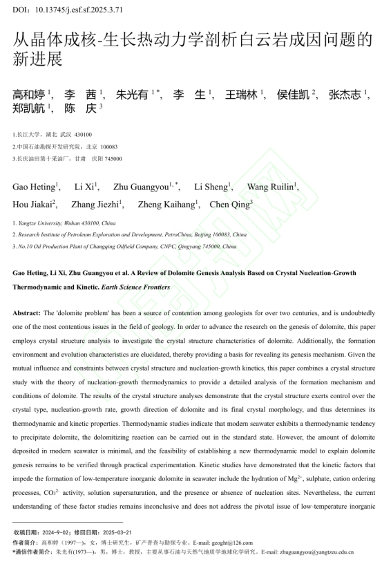 近日,矿产普查与勘探专业2024级博士生高和婷在中文核心(EI)期刊《地学前缘》发表题为“从晶体成核-生长热动力学剖析白云岩成因问题的新进展”的论文。博士生高和婷为论文第一作者,其导师朱光有教授为通讯作者。