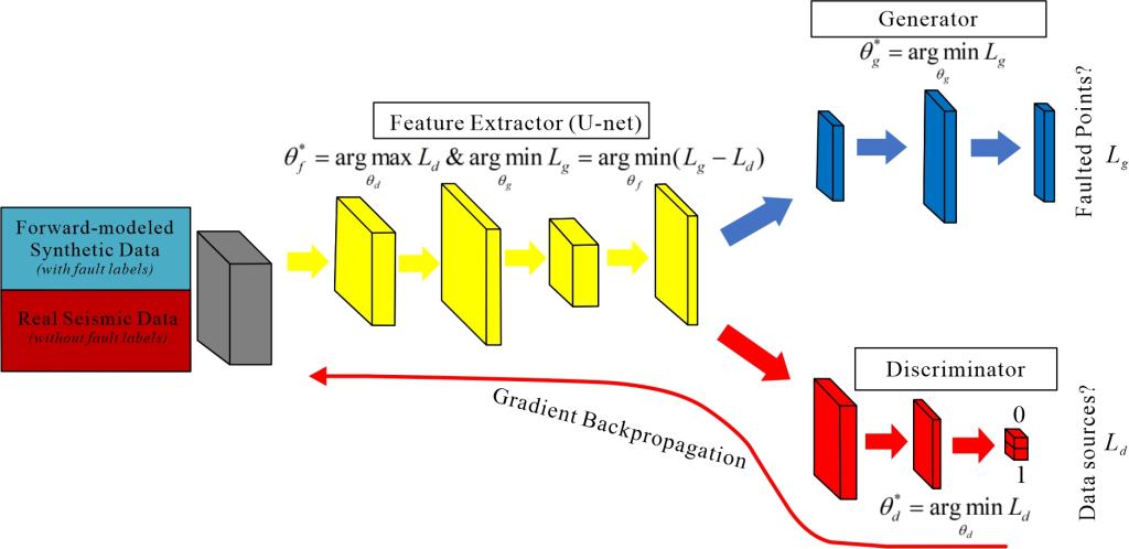 该研究针对复杂地下地质条件与地震数据特征多变背景下,深度学习在断层识别中泛化能力不足、合成数据训练的模型难以直接应用于实际数据预测等问题,提出基于GAN-UNet的深度特征融合方法。模型采用U-net架构作为主干网络,同步提取正演合成数据与真实地震数据的深层特征,通过对抗机制使判别器无法区分特征来源,从而挖掘两类数据的本质共性特征,最终结合断层分类器实现精准识别。以北海F3区块和西部深盆实际地震数据为测试对象,实验表明该方法相较传统深度学习模型在断层识别精度和复杂地质适应性方面具有显著优势,识别结果边界清晰且与地质构造匹配度高。该成果为地震断层智能解释提供了鲁棒性强、跨域适应性佳的新思路,对复杂构造区油气勘探开发具有重要实践价值。