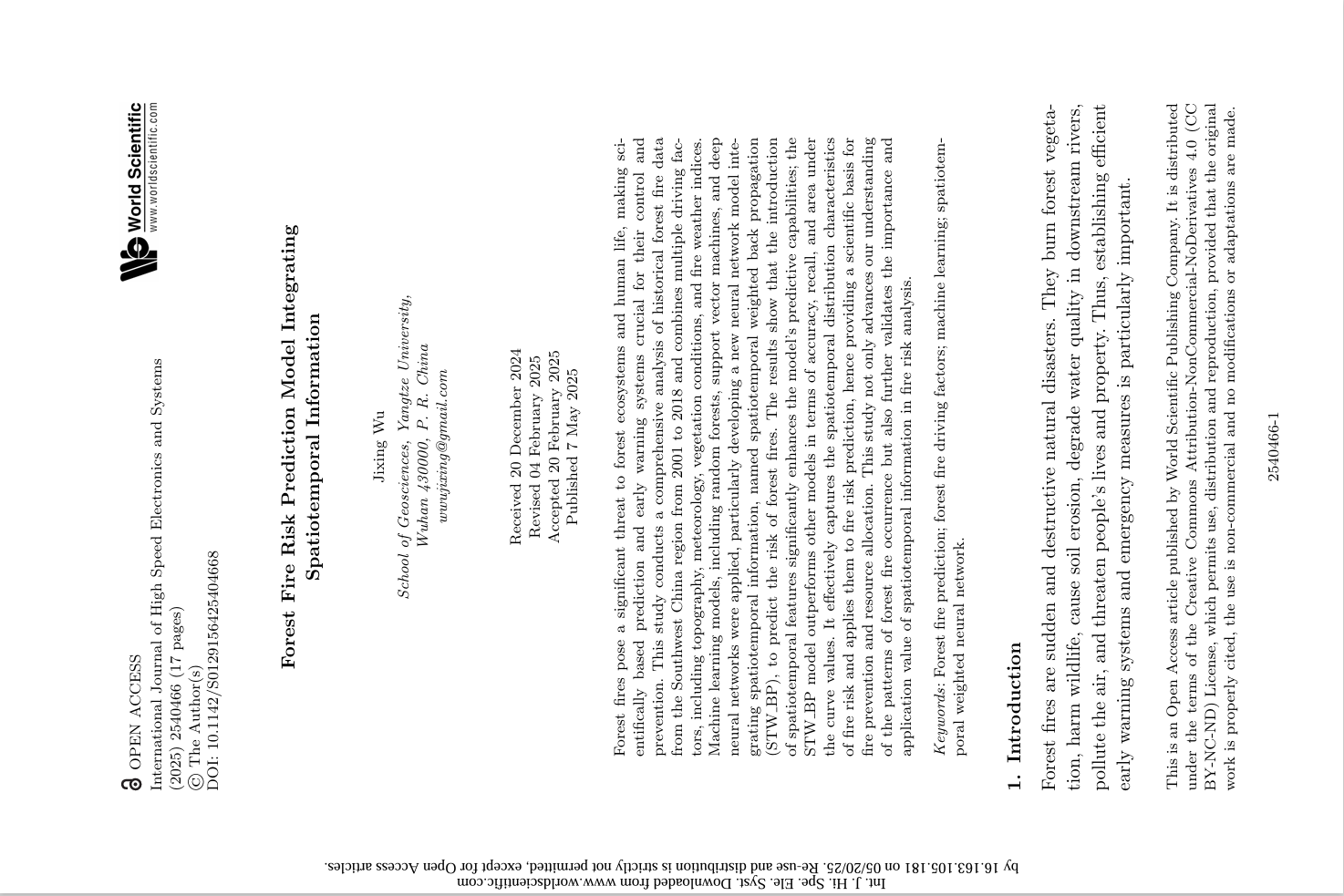 060net永利硕士生吴集星在EI收录期刊《International Journal of High Speed Electronics and Systems》上发表题为“Forest Fire Risk Prediction Model Integrating Spatiotemporal Information”的研究论文。060net永利为论文第一署名单位,吴集星为论文第一作者。
