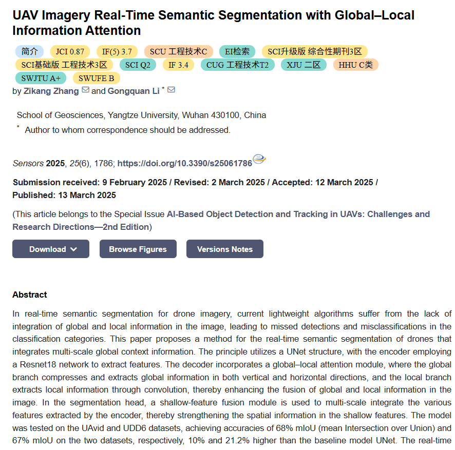 公司硕士研究生张子康在国际学术期刊《Sensors》上发表了题为“UAV Imagery Real-Time Semantic Segmentation with Global–Local Information Attention”的SCI论文,提出了一种利用全局-局部注意力和特征融合的方法用于对无人机实时图像进行语义分割。